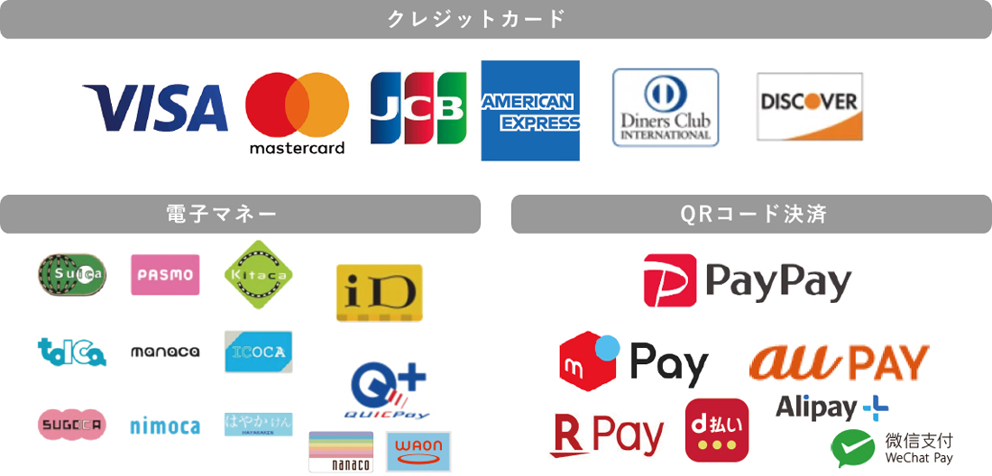 ・下記キャッシュレス決済(クレジットカード、電子マネー決済、QRコード決済)を推奨しております。現金でお支払いの場合、釣銭のないお支払いにご協力をお願いいたします。